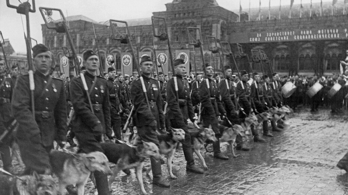 Советские штандарты с наименованием фронтов, под которыми шли сводные полки, шили специалисты Большого театра, а немецкие трофейные флаги общим числом в девять сотен были собраны по всей Германии. Из них к подножию Мавзолея бросят двести. На лобном месте был установлен 26-метровый Фонтан Победителей - «гранитный макет Дома Советов», как писала газета «Правда». Планировался пролет над Красной Площадью 216 самолетов, но буквально за 15 минут до начала Парада полил сильный дождь и авиапраздник пришлось отменить. Командовал Парадом Маршал Рокоссовский на коне вороной масти, принимал Парад маршал Жуков на белом коне. Гимн Советского Союза исполнял оркестр из 1400 военных музыкантов. Героический пес Джульбарс, который помог саперам обнаружить более 7 тысяч мин, по причине ранения не смог пройти в составе школы военных собак и его на руках на кителе Сталина, специально отданном для Джульбарса, пронес командир 37-го отдельного батальона разминирования майор Александр Мазовер (правда, на кинокадрах Парада Джульбарса нет, поэтому, скорее всего, это всего лишь красивая легенда. Но, с другой стороны, Сталин лично просмотрел смонтированный репортаж с Парада, после чего его заново перемонтировали, и какова была первоначальная версия мы уже не узнаем. Так что, возможно, вождь просто не захотел видеть кадры со своим поношенным кителем). Вместе с советскими солдатами в Параде приняла участие знаменная рота Войска Польского. Последними шли 1850 единиц боевой техники – зенитные установки, артиллерийские системы, гвардейские минометы «Катюша», бронемашины, самоходки, танки Т-34 и ИС-2.