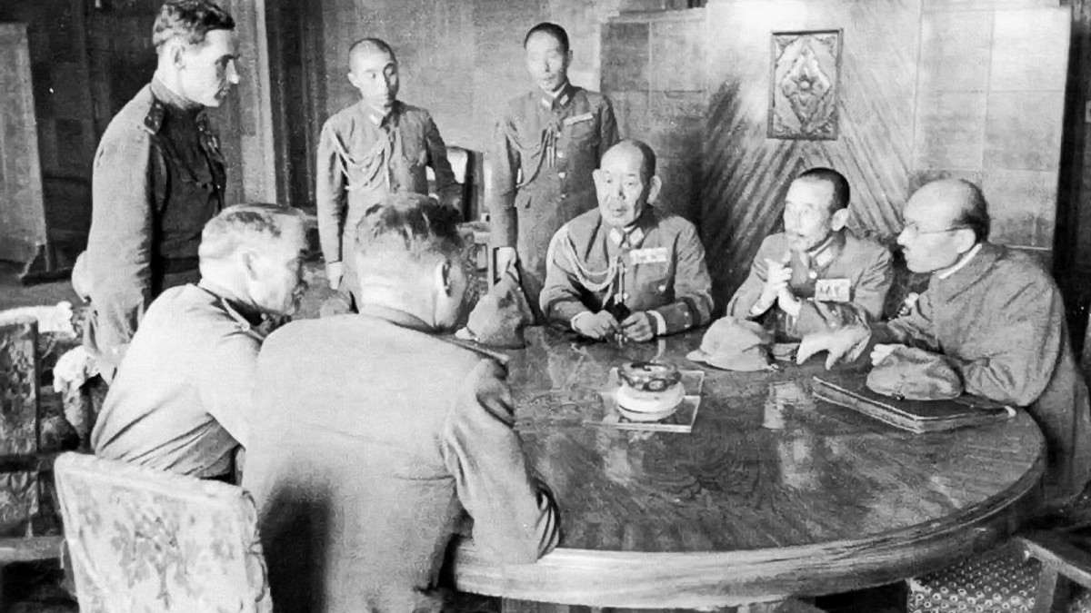 На фото: капитан Петр Титаренко (крайний слева стоит) 19 августа 1945 года в Чаньчуне вместе с делегацией советских парламентеров принимает капитуляцию Квантунской армии