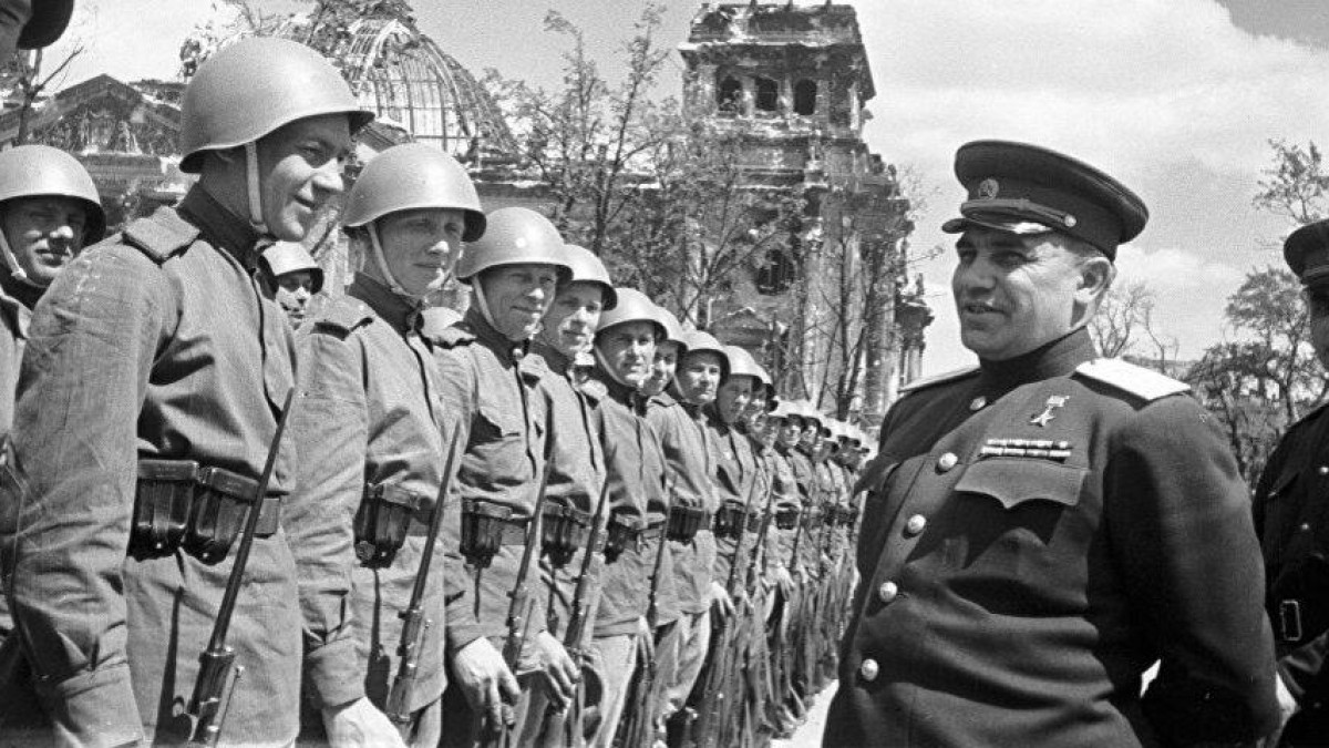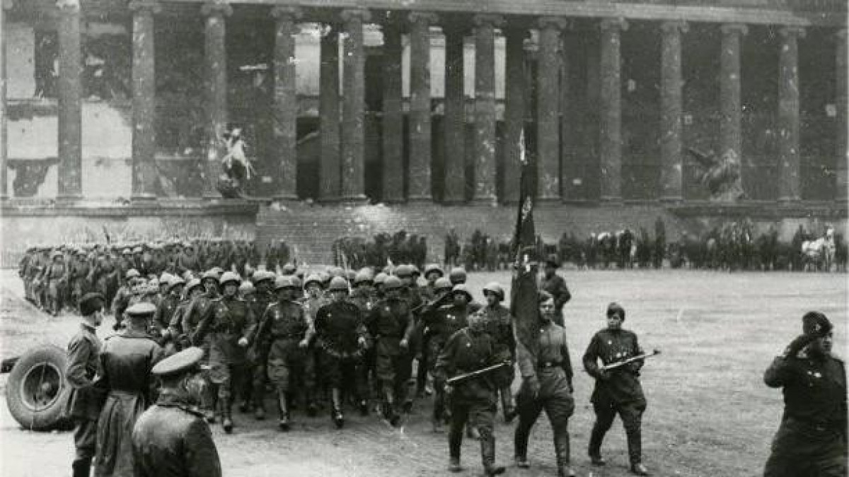 4 мая 1945 года в освобождённом Берлине прошёл первый, пока совсем скромный парад Победы. Прошло всего 2 дня после капитуляции берлинского гарнизона и еще дымились руины рейхстага, вблизи, которого, по площади Бранденбургских ворот шли солдаты-Победители. Принимал парад военный комендант Берлина, командующий 5-й ударной армией, Герой Советского Союза генерал-полковник Николай Берзарин. По разбитой брусчатке прошли строем 2 тысячи военнослужащих Красной Армии и около 50 единиц военной техники.
