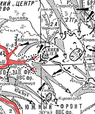 Киевская оборонительная операция 1941 года представляла собой стратегическое усилие Юго-Западного фронта и сил Пинской военной флотилии, направленное на отражение наступления германских войск на Киев и предотвращение их прорыва на Левобережную Украину. После неудачной обороны Западной Украины в 1941 году, войска Юго-Западного фронта, под командованием генерал-полковника М. П. Кирпоноса, состояли из 5-й, 6-й, 12-й и 26-й общевойсковых армий, а также воздушных сил (всего 44 дивизии). Согласно распоряжению Ставки Главного Командования от 30 июня 1941 года, они отходили к рубежу старой государственной границы, стремясь к 9 июля занять укреплённые районы Коростень, Новоград-Волынский, Шепетовский, Староконстантиновский и Проскуровский, чтобы организовать там оборону.