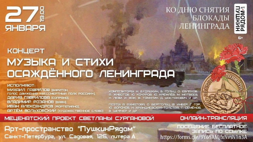 В день полного снятия блокады Ленинграда, 27 января, в 19:00 в арт-пространстве «ПушкинРядом» пройдёт одноимённый концерт, на котором выступит солист крупнейших отечественных и зарубежных музыкальных коллективов, «голос Бессмертного полка России» Михаил Гаврилов. В рамках концерта прозвучат музыка и стихи, написанные в суровые дни и ночи блокадного Ленинграда.