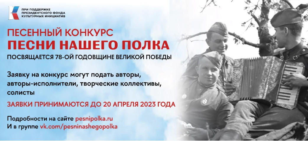 Музыка никогда не оставляла наших солдат в окопах, вселяла надежду на скорое возвращение домой и помогала пережить суровые периоды войны. В честь 78-ой годовщины Победы в Великой Отечественной войне открыт прием заявок на второй песенный конкурс «Песни нашего полка», организованный совместно АНО «Московская дирекция фестивально-концертных проектов авторской песни «Стольный Град» и Бессмертным полком России.