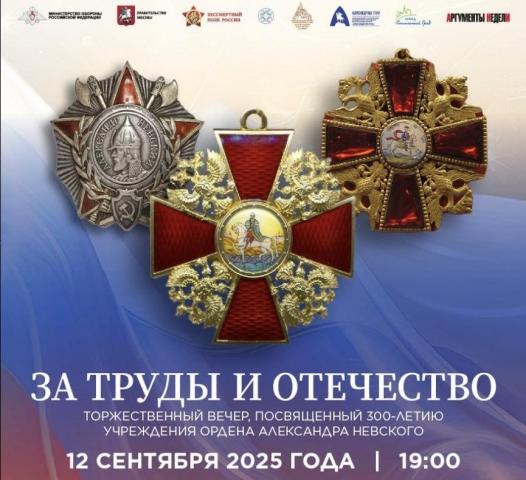 В государственном Кремлевском дворце 12 сентября 2025 года состоится торжественный вечер «За труды и Отечество». Он посвящен 300-летию учреждения ордена Александра Невского, ставшего одной из самых почетных и значимых наград за всю историю России. В этот знаменательный день пройдет концерт для кавалеров ордена, героев СВО, личных составов воинских частей.