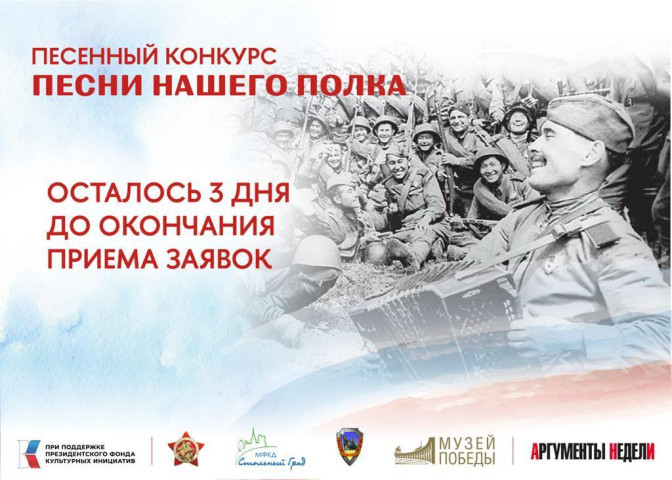 20 апреля завершится прием заявок на конкурс «Песни нашего полка», в числе организаторов которого выступает Бессмертный полк России. Количество поданных заявок уже приблизилось к 500, а количество регионов превысило 50 субъектов Российской федерации. Проект реализуется при поддержке Президентского фонда культурных инициатив.