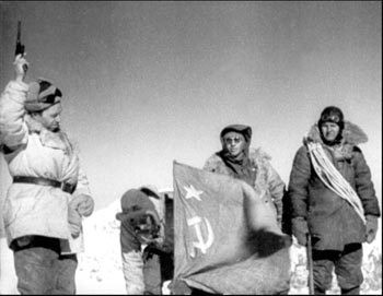 Уже в феврале 1943 г., сразу после изгнания гитлеровцев, командование Закавказского фронта направило на Эльбрус альпинистов снять фашистские штандарты и установить советские красные флаги.