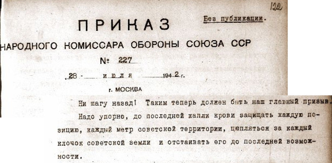 «Население нашей страны, с любовью и уважением относящееся к Красной Армии, начинает разочаровываться в ней, а многие из них проклинают Красную Армию за то, что она отдает наш народ под ярмо немецких угнетателей, а сама утекает на восток. Пора закончить отступление. Ни шагу назад! Таким теперь должен быть наш главный призыв, - говорилось в приказе. – После своего зимнего отсутпления немцы для восстановления дисциплины приняли суровые меры, приведшие к неплохим результатам. Они сформировали более 100 штрафных рот из бойцов, провинившихся в нарушении дисциплины по трусости или неустойчивости, поставили их на опасные участки фронта и приказали им кровью искупить свои грехи. Они сформировали специальные отряды заграждения, поставили их позади неустойчивых дивизий и велели им расстреливать на месте паникеров в случае попытки самовольного оставления позиций и в случае попытки сдаться в плен. Не следует ли нам поучиться в этом деле у наших врагов, как учились в прошлом наши предки у врагов и одерживали потом над ними победу?»