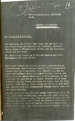 Основанием для встречи в ставке фюрера послужила статья в одной, как подчеркнул Гитлер, «бесстыдной» французской газете, что, якобы, война против СССР является войной в интересах всей Европы. Да, сказал Гитлер, dажно, чтобы мы не раскрывали своих целеустановок перед всем миром. Мы не желаем превращать преждевременно кого-либо в своих врагов. Мы подчеркиваем, что мы приносим свободу. Не должно быть распознано, что дело касается окончательного регулирования «русского вопроса»: «Создание военной державы западнее Урала никогда не должно снова стать на повестку дня, хотя бы нам для этого пришлось воевать сто лет. Никогда не должно быть позволено, чтобы оружие носил кто-либо иной, кроме немцев. Только немец вправе носить оружие, а не славянин, не чех, не казак и не украинец».