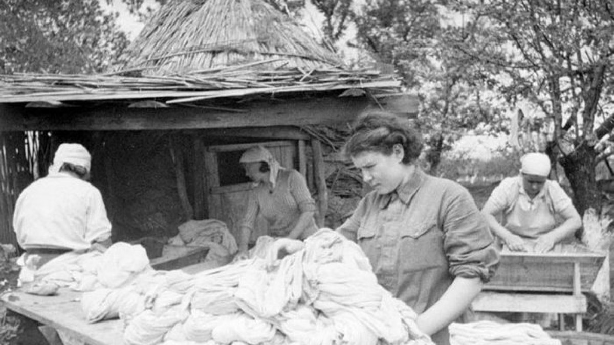 «Белье привезут, оно заношенное, завшивленное. Халаты белые, ну эти, маскировочные, они насквозь в крови, не белые, а красные. Черные от старой крови. В первой воде стирать нельзя - она красная или черная, - вспоминала Мария Детко. - Гимнастерка без рукава, и дырка на всю грудь, штаны без штанины. Слезами отмываешь и слезами полощешь. И горы, горы этих гимнастерок... Ватников... Как вспомню, руки и теперь болят. Зимой ватники тяжелые, кровь на них замерзшая. Я часто их и теперь во сне вижу... Лежит черная гора…».