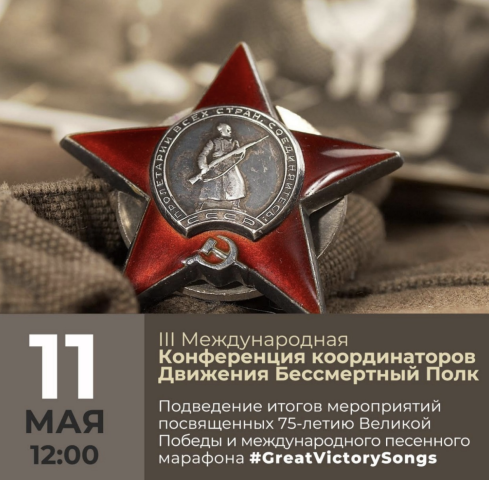 Состоялась III Международная Конференция координаторов Движения Бессмертный Полк. Главной темой Конференции было подведение итогов мероприятий, проведенных 8 и 9 мая 2020 года, посвященных 75-летию Великой Победы и международного песенного марафона #GreatVictorySongs. В работе Конференции приняли участие координаторы Движения Бессмертный Полк Ливии, Испании, Азербайджана, Северной Ирландии, Нидерландов, Португалии, Швейцарии, ЮАР, Италии, Франции, Таиланда, Сенегала, Канады, Израиля, Кореи, Республики Конго, Острова Маврикий, Великобритании, Катара, Ирландии, Нигерии, России, Иордании, Кипра, Бельгии, Латвии, Исландии, Швеции, Аргентины, Непала, Сирии и Камбоджи.