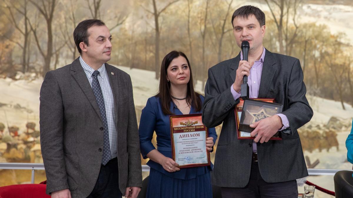 Их региональные лидеры получили памятные награды. В импровизированную студию смогли приехать член Центрального штаба, руководитель регионального штаба Бессмертного полка России в Смоленской области Денис Пестунов и руководитель регионального штаба движения в Московской области Валерий Анисимов. Они получили свои награды от руководителя Исполкома Движения Артема Хуторского.