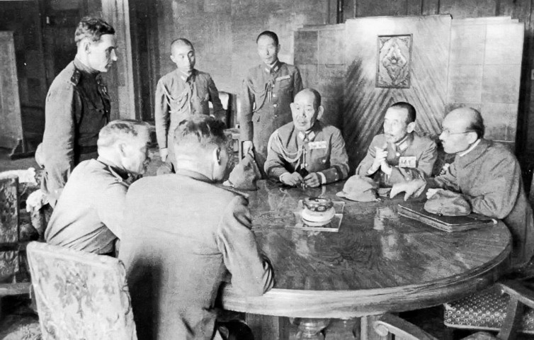 На фото: капитан Петр Титаренко (крайний слева стоит) 19 августа 1945 года в Чаньчуне вместе с делегацией советских парламентеров принимает капитуляцию Квантунской армии