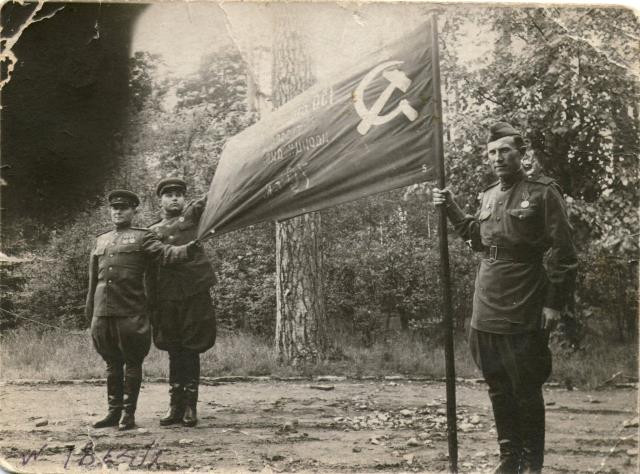 На фото со знаменем 150-й Идрицкой дивизии в мае 1945 года справа налево: командир роты 756-го стрелкового полка старший сержант Илья Съянов, командир батальона 674 стрелкового полка капитан Василий Давыдов и командир 756 стрелкового полка полковник Федор Зинченко. Все – Герои Советского Союза.