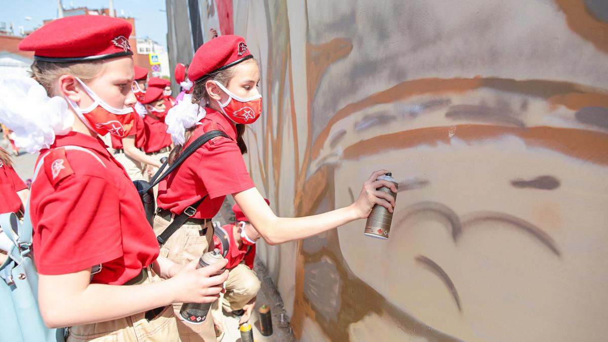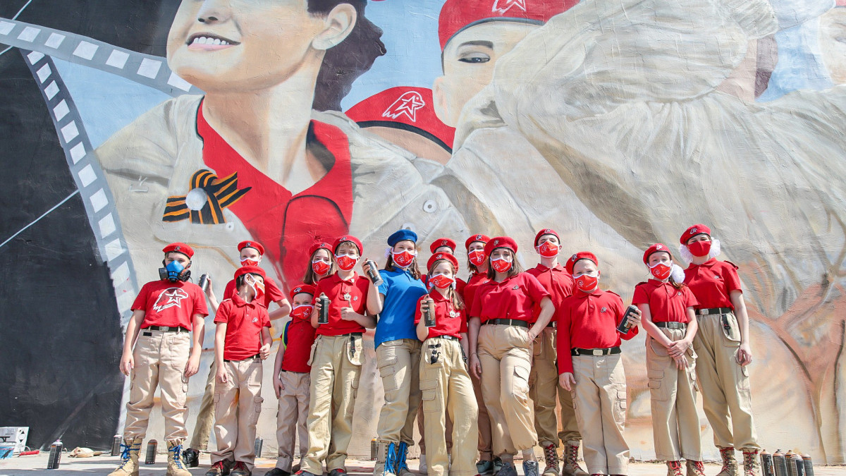 По другую сторону граффити нарисованы юнармейцы - все они почти ровесники юного Вани из "Офицеров". Каждый юнармеец - участник юбилейного Парада Победы на Красной площади в 2020 году.