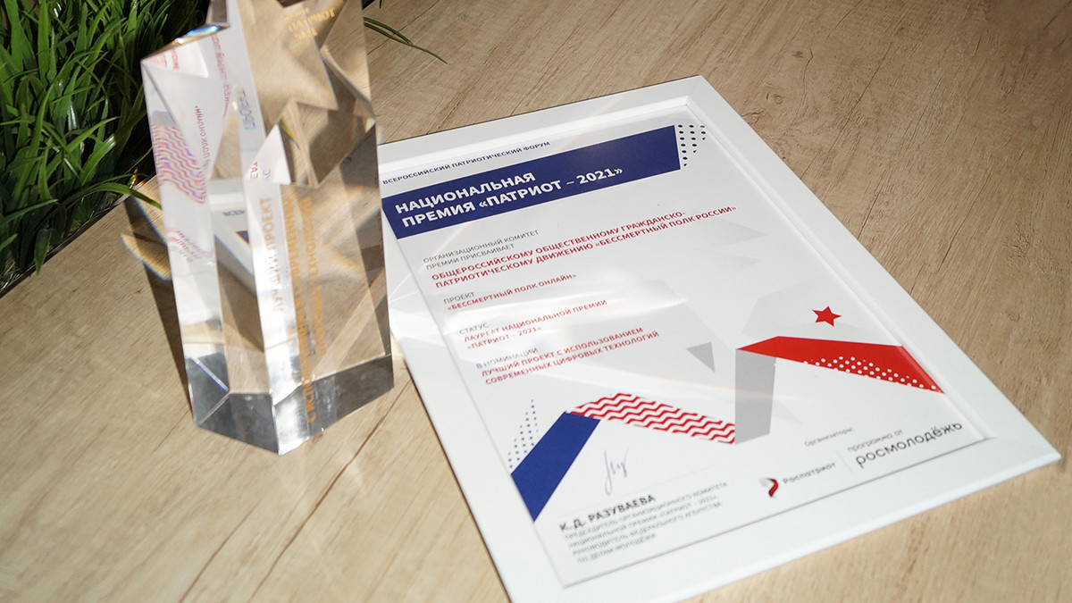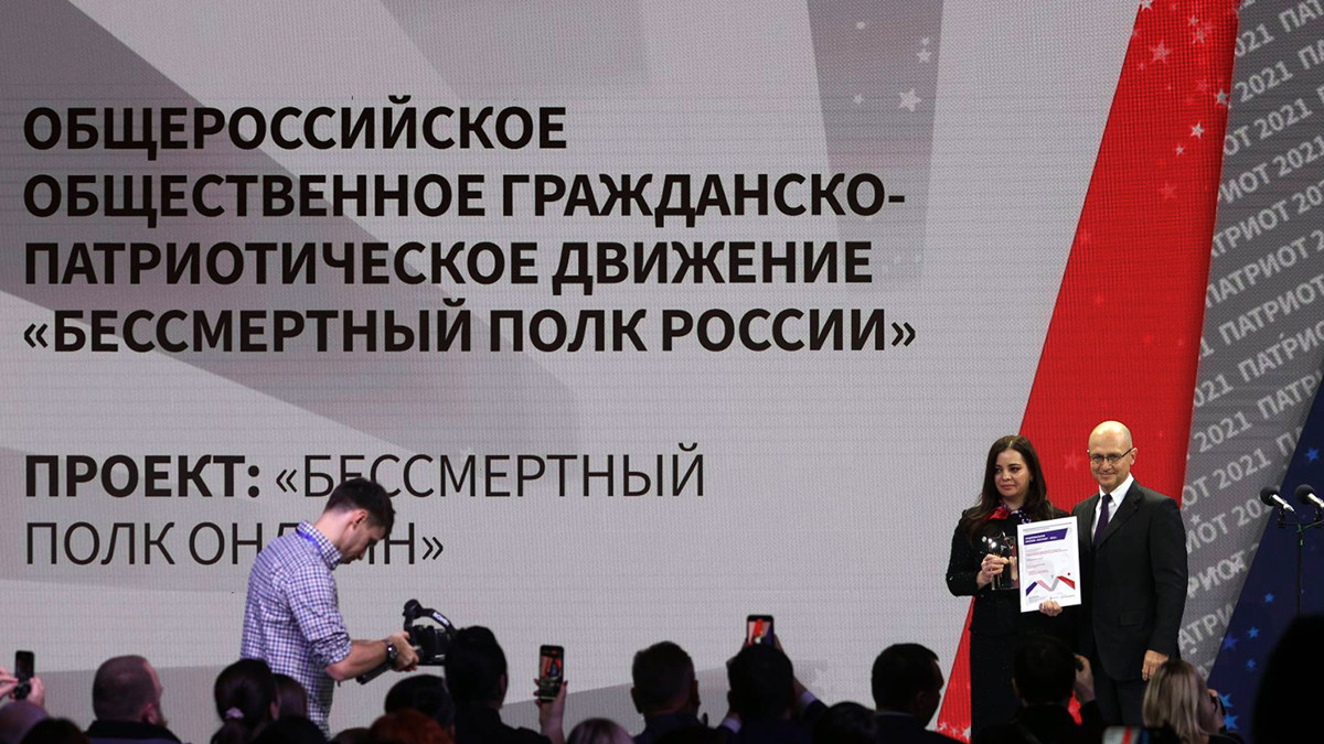 На Всероссийском патриотическом форуме названы лауреаты премии «Патриот – 2021». Участие в церемонии награждения принял первый заместитель руководителя администрации президента Российской Федерации Сергей Кириенко, который вручил награду в номинации «Лучший проект с использованием современных цифровых технологий» акции Бессмертного полка России «Бессмертный полк онлайн».