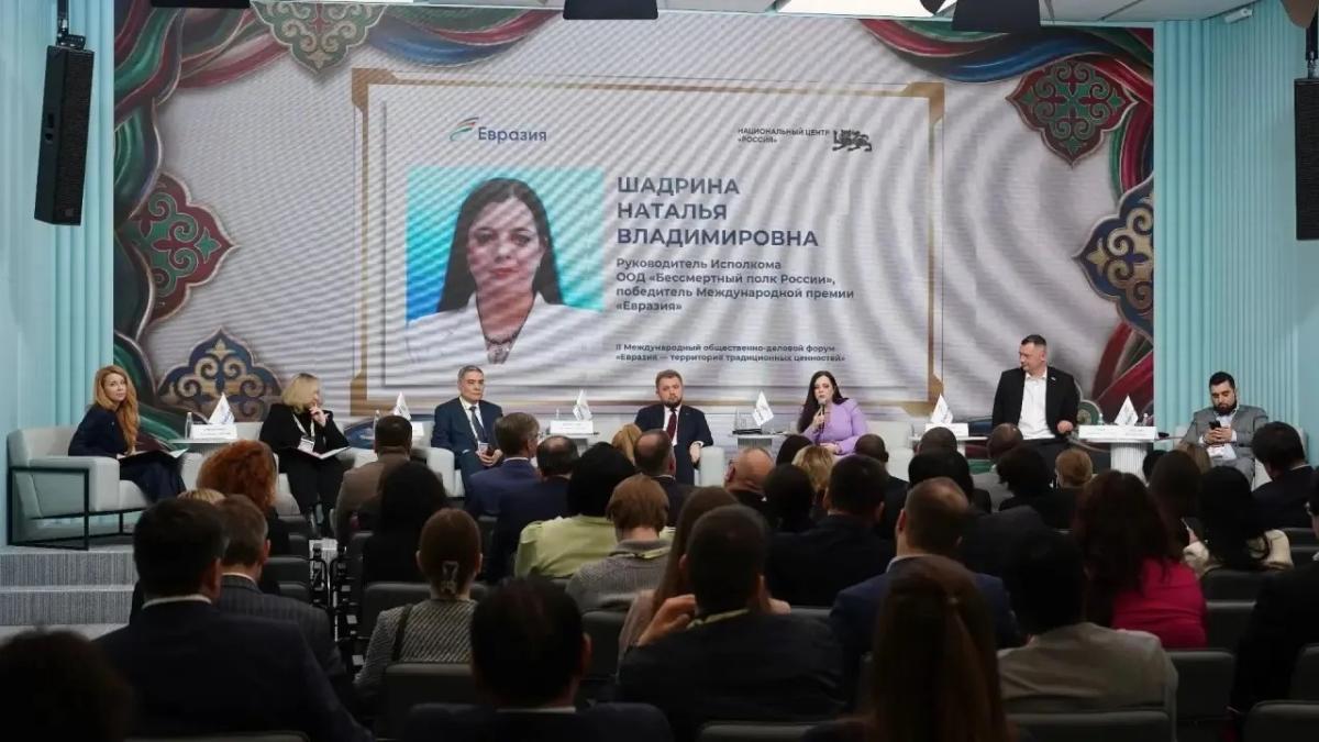 Руководитель Исполкома Бессмертного полка России Наталья Шадрина выступила на сессии Международного общественно-делового форума «Евразия - территория традиционных ценностей», который прошел 23 апреля в Национальном центре «Россия».