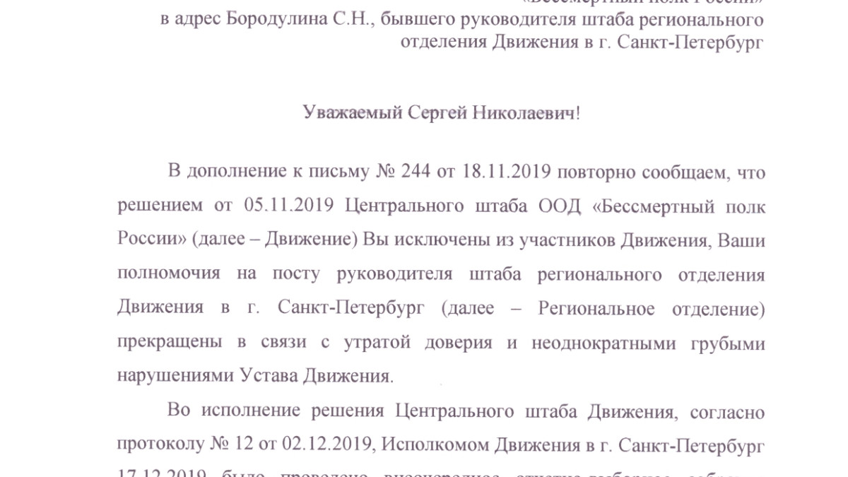 Открытое письмо Сопредседателей Центрального штаба ООД «Бессмертный полк России» в адрес С.Н. Бородулина