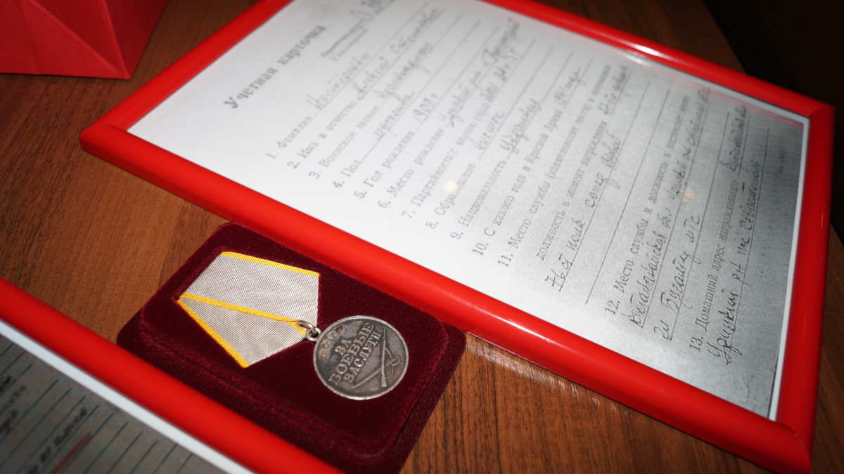 На торжественной церемонии в Музее Победы племянник красноармейца Алексея Степановича Нестеренко Владимир Иванович и внук Игорь Владимирович Грибановы получили вновь обретенную медаль «За боевые заслуги».