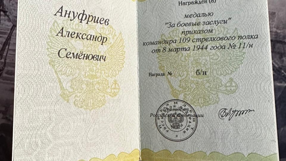 Наталья Алексеевна Тинькова обратилась в Бессмертный полк России пять лет назад в поиске места захоронения родного дяди. А в процессе исследования боевого пути и архивных документов Министерства обороны Российской Федерации, сотрудники отдела по работе с обращениями граждан выяснили информацию о неврученных в годы войны боевых наградах красноармейца Александра Ануфриева.
