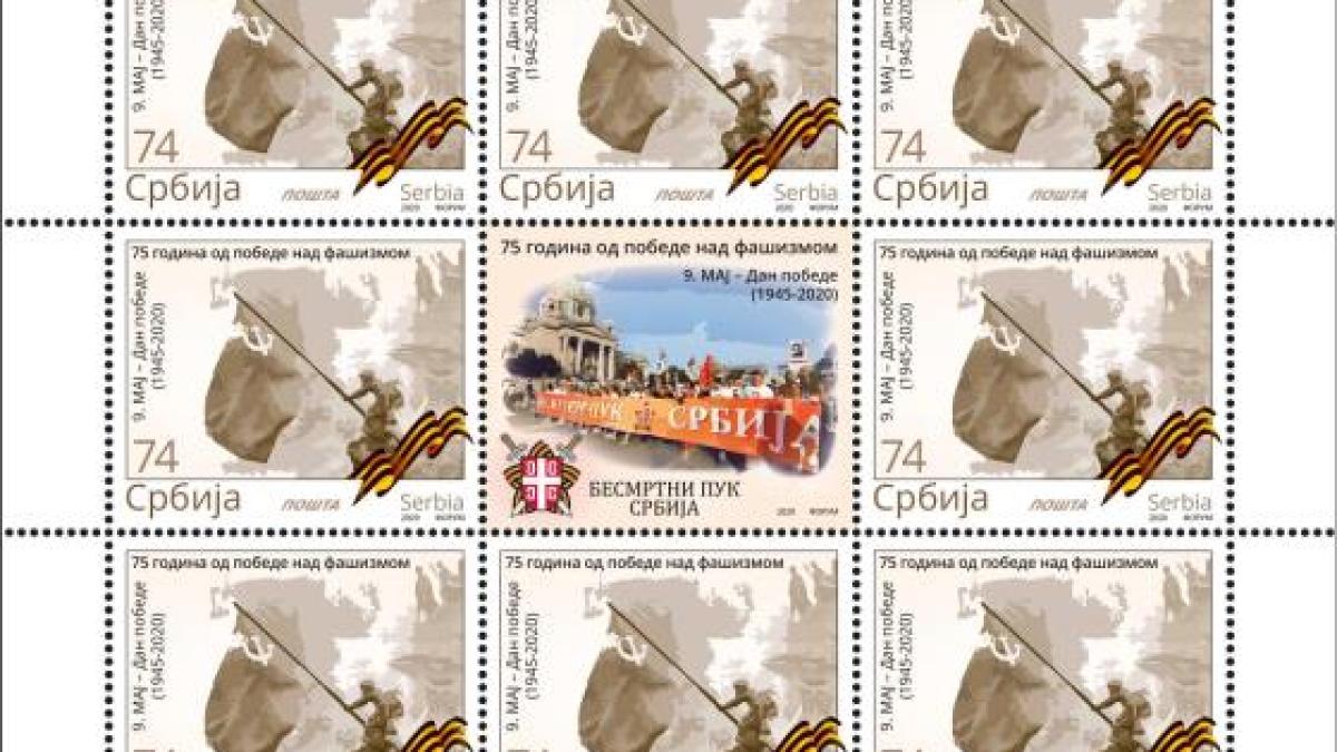 Завтра, 9 мая в Сербии по инициативе Президента Республики Александра Вучича и по предложению Министра труда, занятости по делам ветеранов и социальным вопросам Зорана Джоржевича будут выпущены почтовые марки и памятный конверт в честь Бессмертного полка и 75-летия Победы над нацизмом. Последний раз почтовые марки, посвященные Дню Победы были выпущены в Югославии 35 лет назад.
