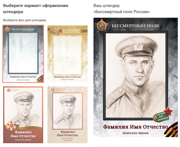 Здесь есть варианты шаблонов с фото и без, а также по желанию можно добавить тематические стикеры «За мир без нацизма!», «Мой дед воевал против нацизма!», «Мой отец воевал против нацизма!».