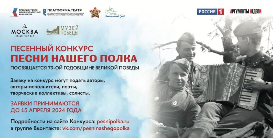 Продолжается III Всероссийская патриотическая акция «Песни нашего полка», посвященная 79-летию Победы в Великой Отечественной войне, которая включает в себя песенный конкурс и Большой праздничный концерт «Песни Победы», премьера которого состоится 9 мая на телеканале «Россия 1».