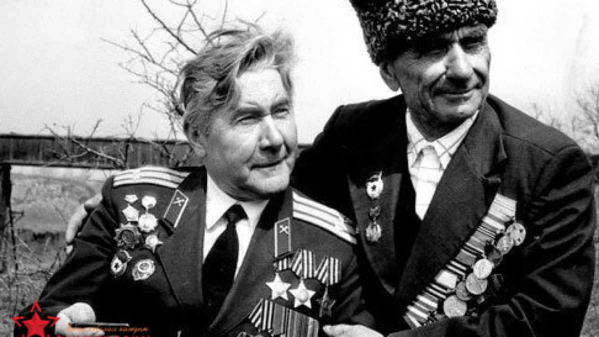 На фото: на снимке, сделанном 2 мая 1945 года на рейхстаге сержанта Ковалева со ззнаменем поддерживает старший сержант Исмаилов..