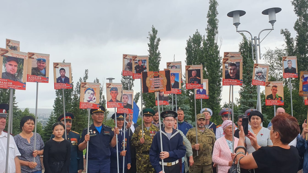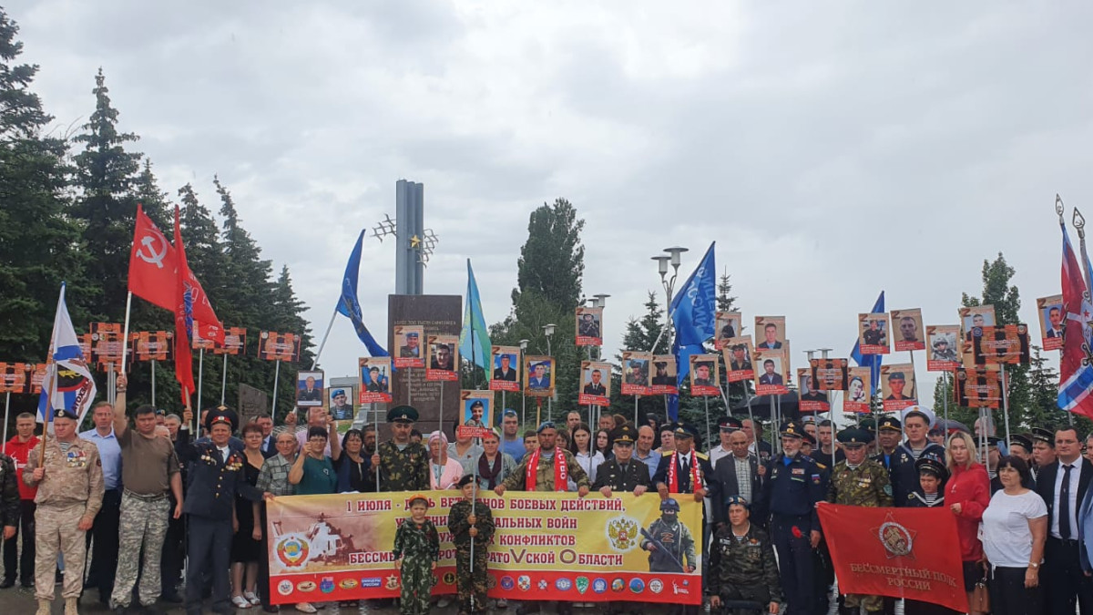 Региональные отделения Бессмертного полка России и Боевого Братства в Саратовской области прошли в едином строю Бессмертной роты Саратовской области со штандартами локальных войн и военных конфликтов и портретами погибших в специальной военной операции от мемориала Землякам, погибшим в локальных войнах к Вечному огню.