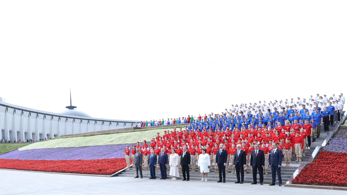 У флагштока в виде российского триколора построились представители общественных организаций, волонтёры, поисковики, юнармейцы и многие другие. Бессмертный полк России в «живом» флаге вошел в ряды белого цвета. На торжественную церемонию поднятия флага собрались Герои труда России и лауреаты Государственных премий, сегодня получившие свои награды в Кремле.