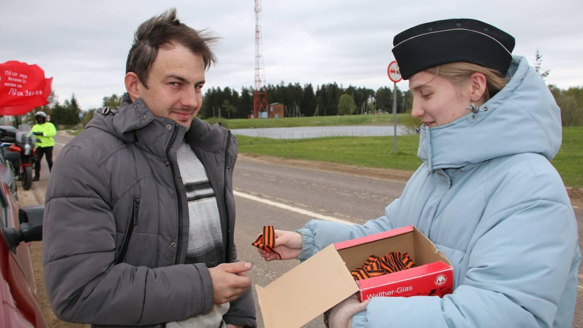 В День Победы участники театральной группы «Маска», одетые в военную форму 40-х годов, провели акцию «Георгиевская ленточка», раздавая символ Победы.
