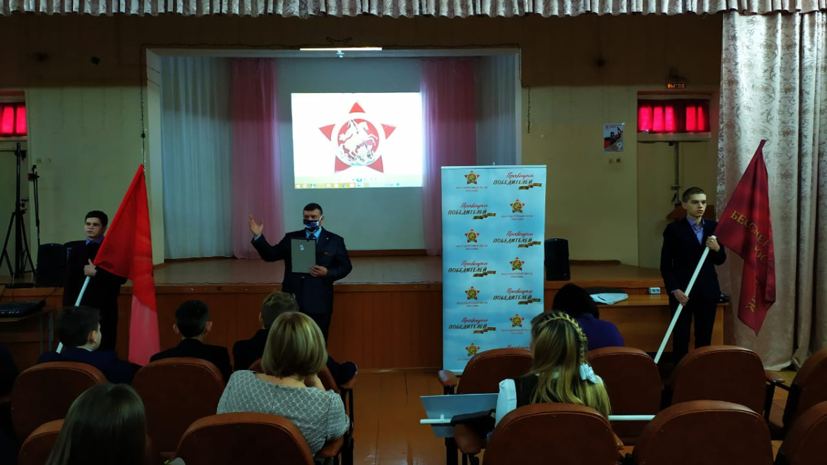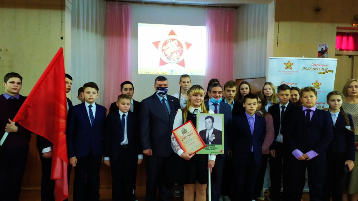 На церемонию она пришла с портретом своего прадеда и с папкой, в которой собраны все семейные реликвии и материалы о его военной судьбе. Победительница регионального этапа конкурса «Правнуки победителей» рассказала о своем героическом прадеде, которому была посвящена ее исследовательская работа. Одноклассники Эвелины прочитали стихи о войне, а в завершении встречи в актовом зале показали шествие виртуального Бессмертного полка Иссы, которое все присутствующие смотрели стоя.