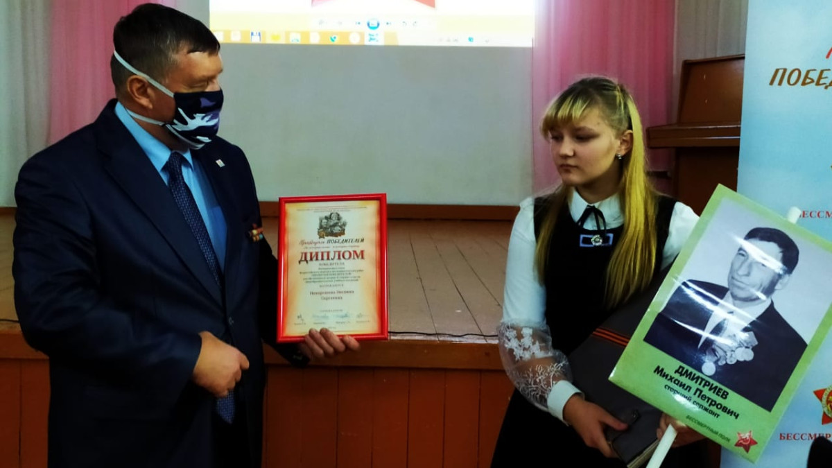 Руководитель регионального штаба Бессмертного полка России Олег Шибаев после возложения цветов к Монументу воинской и трудовой Славы отправился вручать заслуженные диплом и призы ученице седьмого класса Эвелине Нехорошевой.