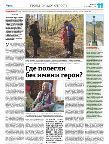 Есть у Марии Иванкиной и медаль «Мать-героиня». С супругом, тоже железнодорожником, они вырастили и дали дорогу в жизнь семерым детям. Все они выучились и разъехались. Сейчас 97-летняя Мария Спиридоновна, с годами совсем потерявшая зрение, живёт в родной деревне с младшим сыном Владимиром. Что же касается истории безымянных могил советских воинов в лесу, то больше об этом спросить некого. Главе Наследницкого сельского поселения Раисе Мальцевой тоже впервые довелось услышать о вероятных захоронениях военных на их территории только от нас.