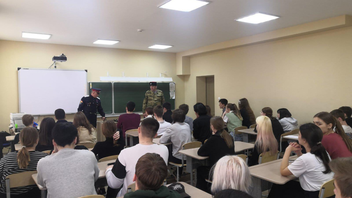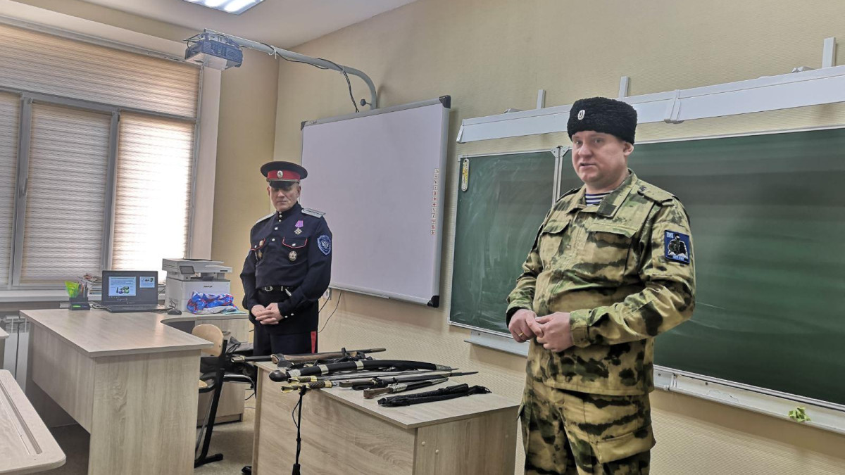 В рамках Урока мужества участники специальной военной операции - руководитель исполкома регионального отделения Бессмертного полка России в Саратовской области Андрей Бердников и заместитель атамана Саратовской области Волжского войскового казачьего общества, командир Пластунской сотни Сергей Фролов – поделились фронтовыми историями о героизме сослуживцев и ответили на вопросы школьников.