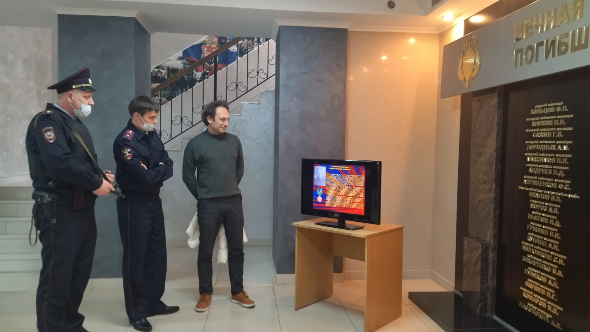 Презентация созданная командиром «Бессмертного полка УМВД России по Калининградской области», историком УМВД полковником полиции в отставке А.М. Щегловым, непрерывно транслируется на информационном экране в здании УМВД, а также разослана во все структурные подразделения, сотрудникам органов внутренних дел.