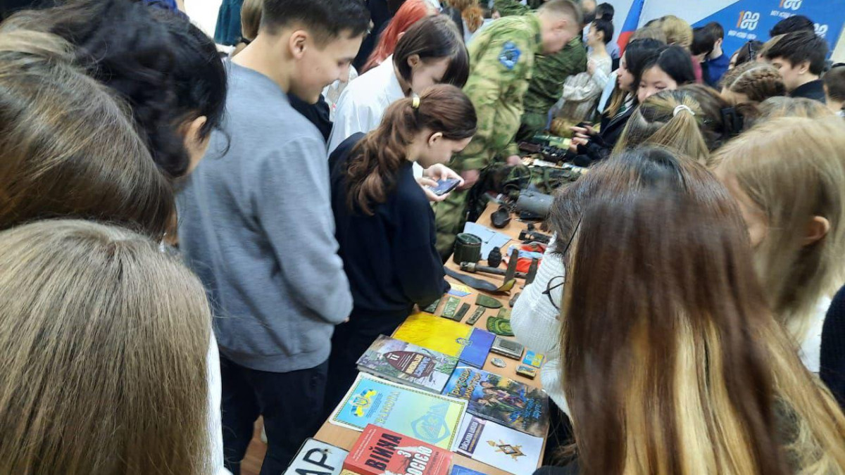 Андрей Бердников и Олег Мысов показали трофеи с территории Украины и зоны боевых действий. Среди трофеев были учебники украинской истории с полным искажением исторических данных, и амуниция ВСУ с нацистской символикой. Среди экспонатов передвижного музея были представлены элементы вооружения российских военных и их форма, что вызвало у ребят живой интерес.