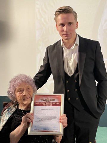 Открыл торжественное мероприятие в честь векового юбилея «голос Бессмертного пока России», солист крупнейших отечественных и зарубежных музыкальных коллективов Михаил Гаврилов песней «Поклонимся великим тем годам», он передал Марии Денисовне подарки и поздравления от Бессмертного пока России: «Есть люди, которыми гордится Россия. И Вы – одна из них! Ваши храбрость, удивительная стойкость, бесстрашие и сила воли достойны безграничного восхищения! Наша Отчизна останется непобедимой, пока у нас есть Вы, Мария Денисовна!»
