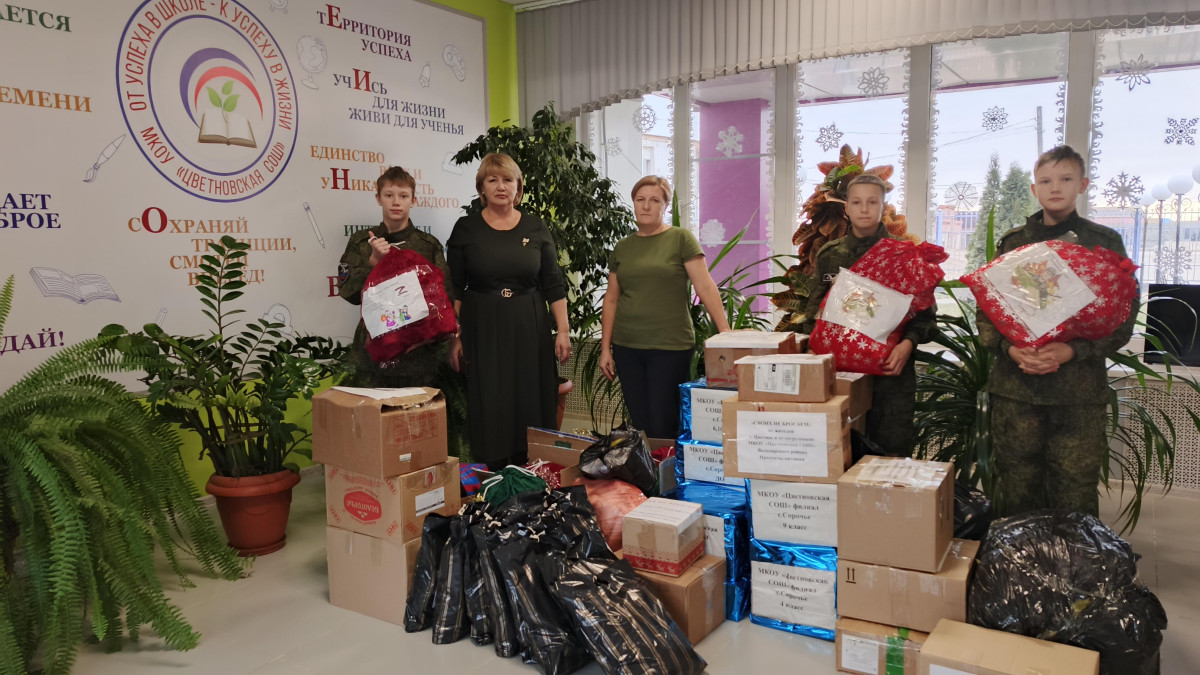 В последние дни уходящего года учащиеся, педагоги и родители Цветновской СОШ в Астраханской области вместе с активистами Движения отправили новогодний гуманитарный груз в зону СВО для защитников нашей страны. В этот раз ребята собрали новогодний подарок из различных угощений, писем, детских поздравительных открыток, а также теплой одежды и маскировочных сетей.