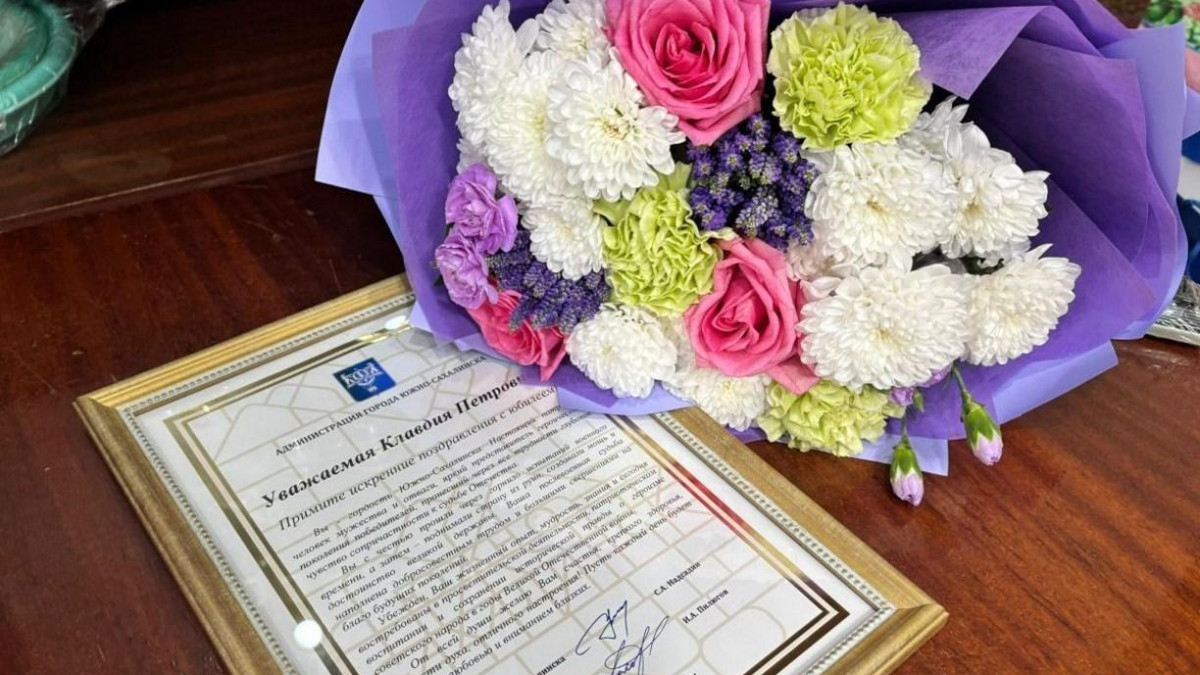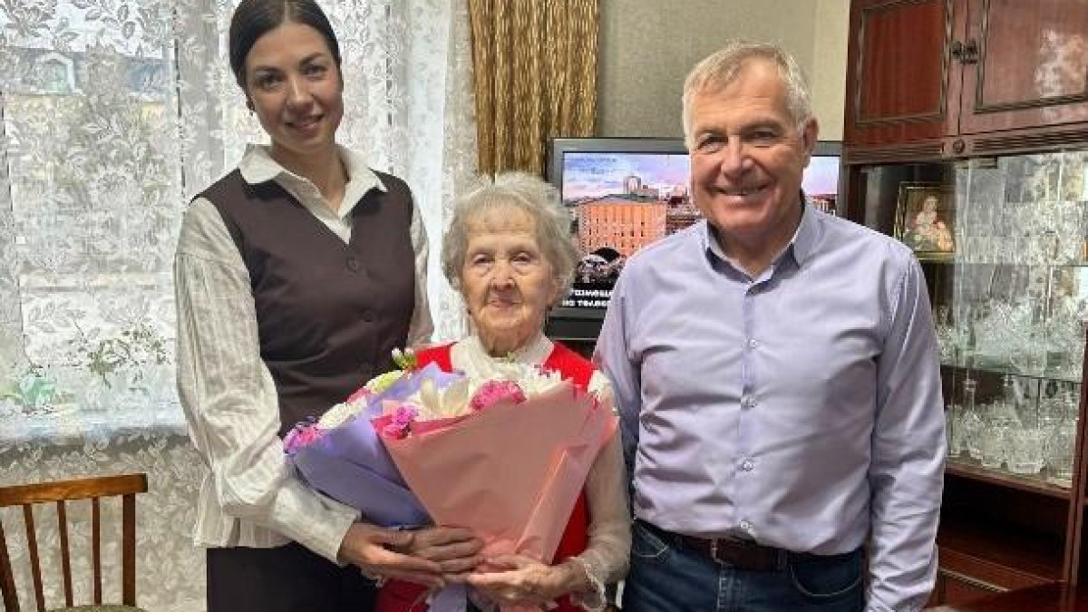 От имени мэра города Клавдию Петрову поздравили сотрудники департамента внутренней политики, которые вручили ей приветственный адрес от Сергея Надсадина: