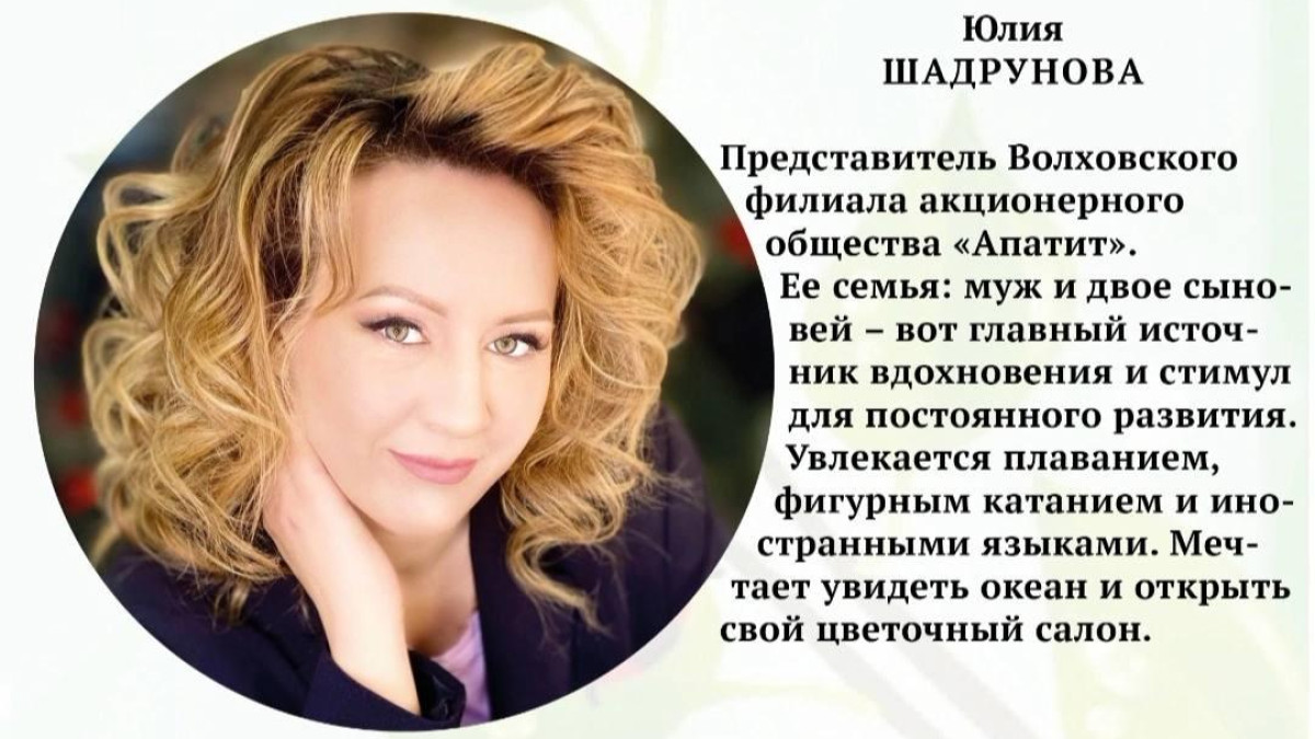«Миссис Волхов» выбирают уже в восьмой раз, в этом году его основная тема — «Код семьи». Все творческие номера участницы посвятили традиционным ценностям: взаимоотношениям супругов, воспитанию детей, уважению к старшему поколению. Юлия Шадрунова - специалист социального отдела ВФ АО "Апатит", она получила титул "Миссис Артистизм". В её выступлении оказали поддержку добровольцы регионального штаба Бессмертного полка России в Ленинградской области. Участница рассказала о том, что чтит память о своих предках и ежегодно принимает участие в шествии Бессмертного полка.