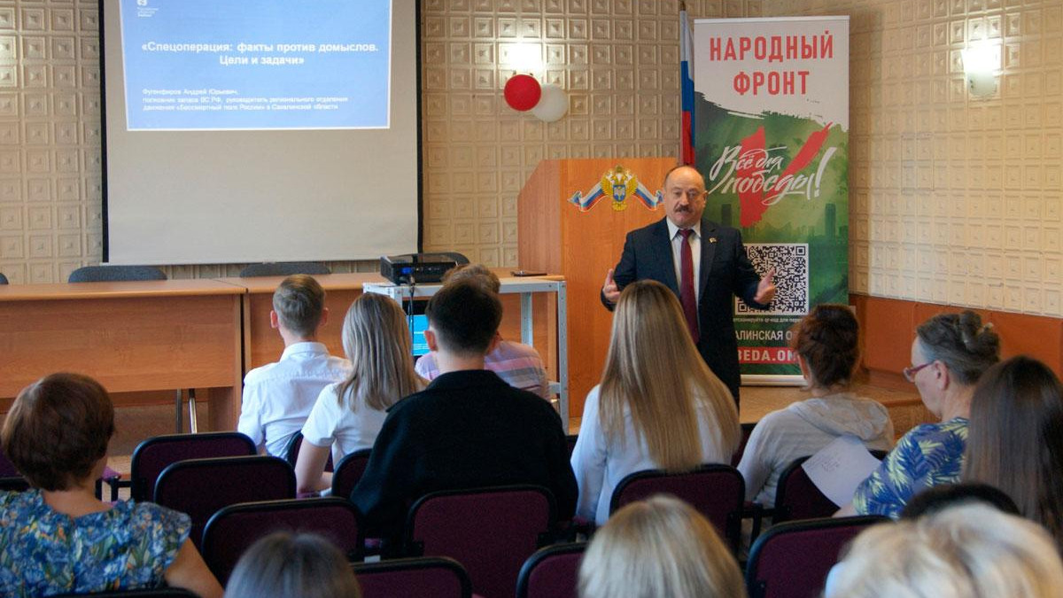 Для сотрудников организаций лекцию провел руководитель штаба регионального отделения Бессмертного полка России в Сахалинской области, ветеран военной службы и полковник запаса Андрей Фугенфиров.