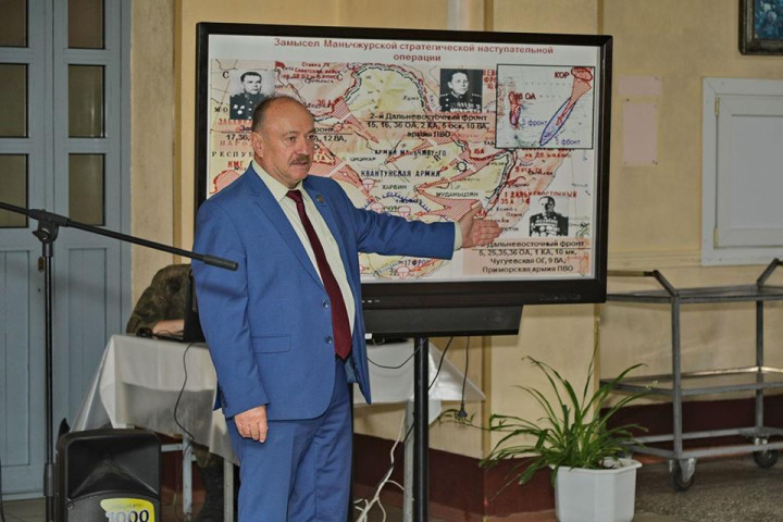 Лектор пояснил, что Советско-японская война 1945 года – это составная часть, завершающий этап Второй мировой войны в целях ликвидации последнего очага Второй мировой войны, оказания помощи союзникам по антигитлеровской коалиции и народам оккупированных Японией стран.