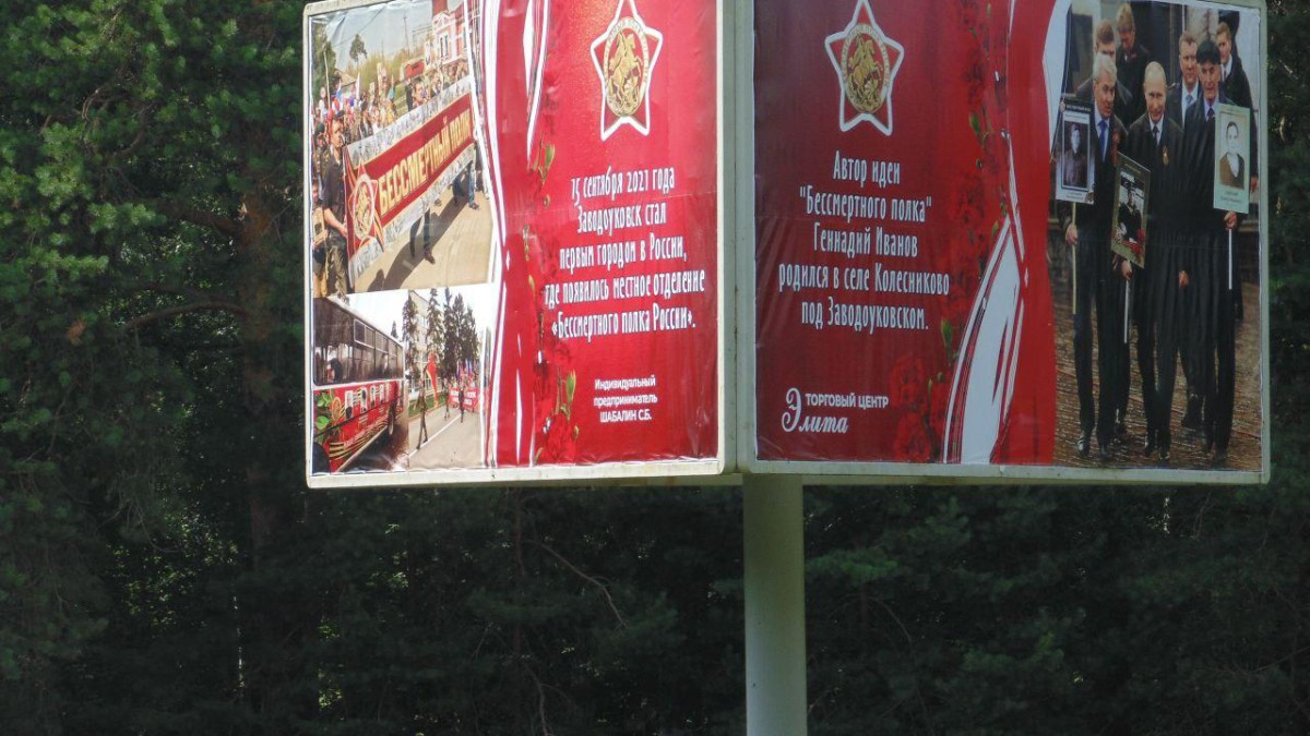 В этом году движение «Бессмертный полк России» отмечает своё 10-летие. Первый юбилей организаторов самой масштабной акции в День Победы. К этому событию на родине акции "Бессмертный полк" в Тюменской области установили три щита, посвящённых истории Движения. Эти щиты размещены на объездной дороге города Заводоуковска.