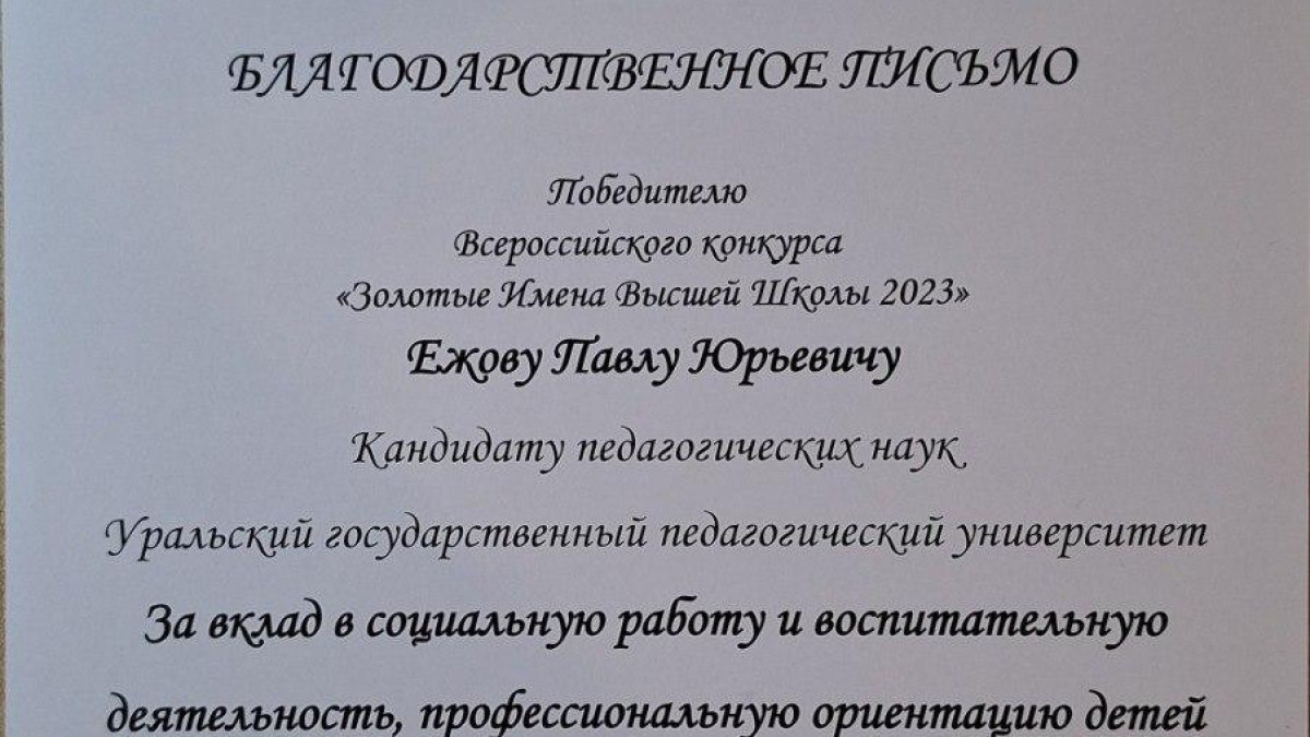 Руководитель исполкома регионального отделения Бессмертного полка России в Свердловской области Павел Ежов стал победителем Всероссийского конкурса «Золотые имена высшей школы». Церемония награждения состоялась в Министерстве науке и высшего образования России в Москве.
