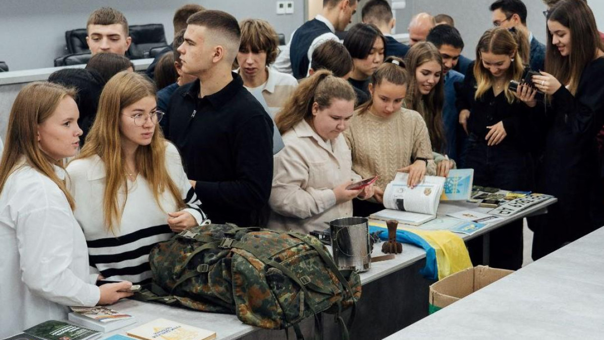 Спикеры также презентовали ребятам мобильный музей, экспонатами которого стали образцы оружия, обмундирования и литература, привезенные с освобожденных территорий.