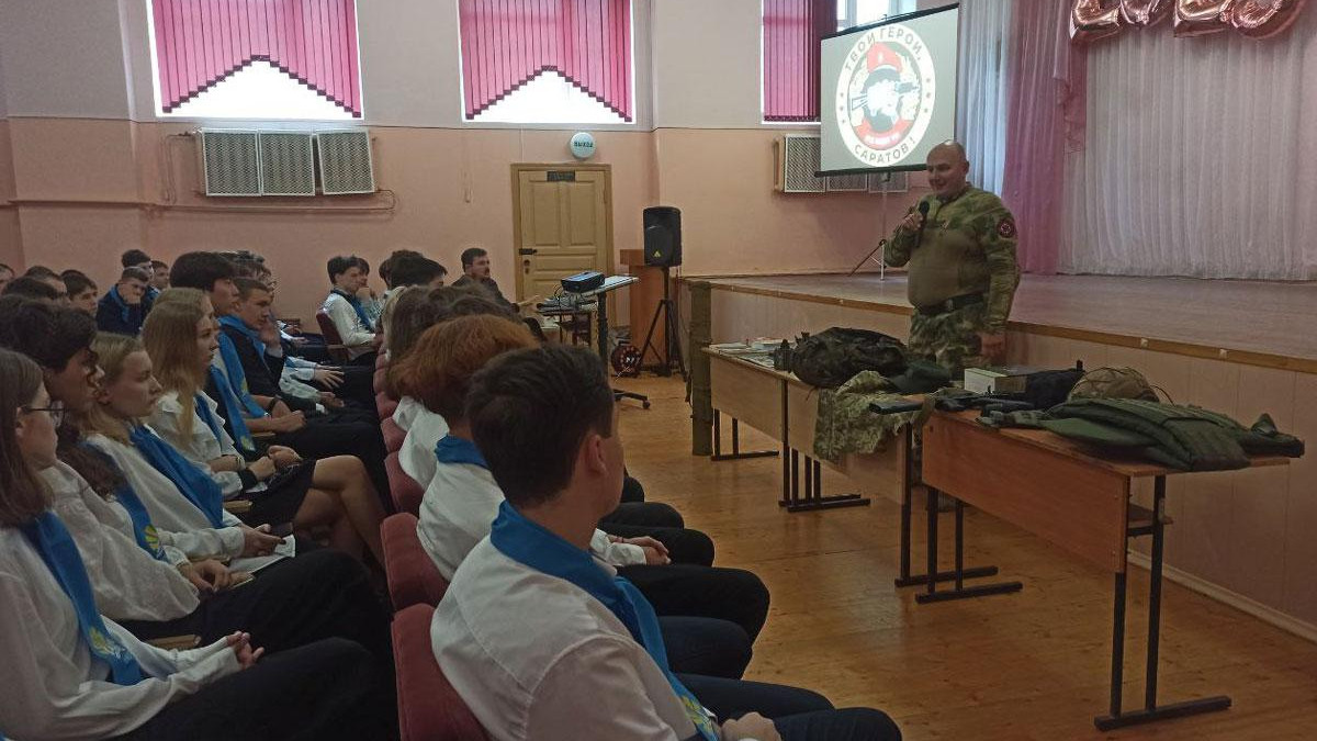 Сегодня в рамках военно-патриотического воспитания для школьников урок мужества провели руководитель исполкома регионального отделения Бессмертного полка России в Саратовской области, ветеран боевых действий и участник СВО Андрей Бердников вместе с волонтером общественной организации «Твои герои, Саратов» Дмитрием Молоковым.
