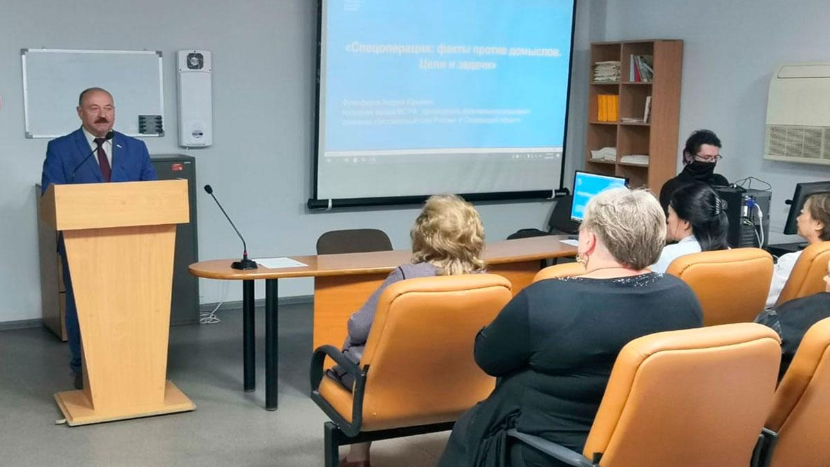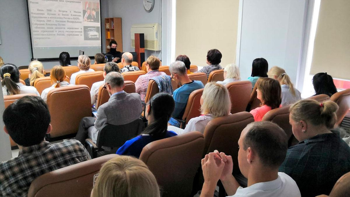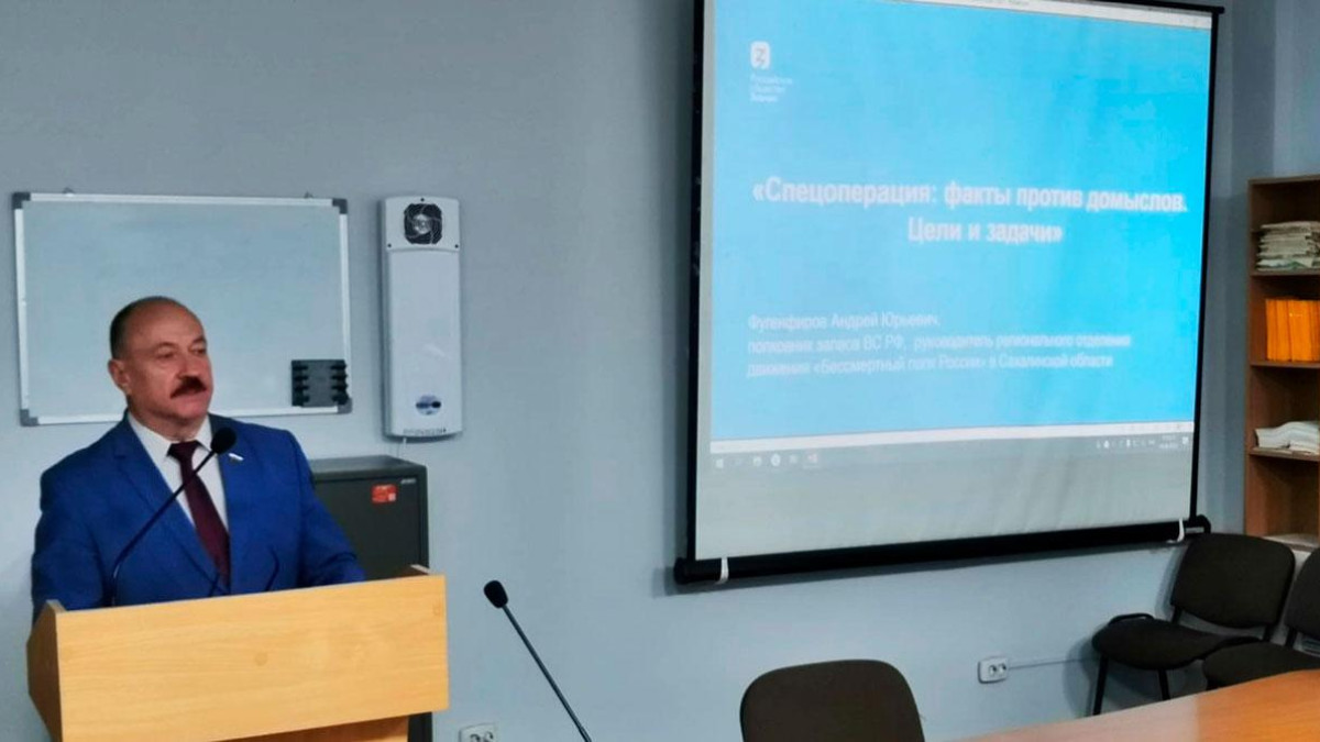 Вчера в Центре гигиены и эпидемиологии в Сахалинской области руководитель штаба регионального отделения Бессмертного полка России в Сахалинской области, ветеран военной службы и полковник запаса Андрей Фугенфиров прочитал лекцию под названием «Спецоперация: факты против домыслов. Цели и задачи». Тема лекции была посвящена современным событиям у западных границ России.
