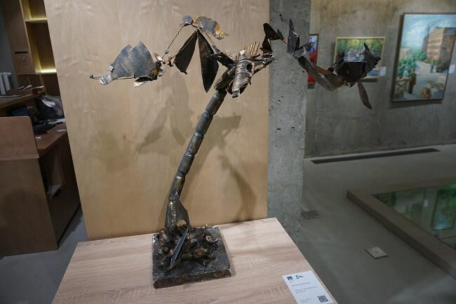 Экспозиция получилась доброй и светлой: никаких военных реалий, кроме одного исключения - созданная из фрагментов разорвавшихся снарядов скульптура «Феникс. Возрождение Донбасса». Она производит сильное впечатление. Автор неизвестен, но есть дата создания — 2014 год, то есть начало военных действий. И именно она — первое, с чем сталкиваются зрители экспозиции.