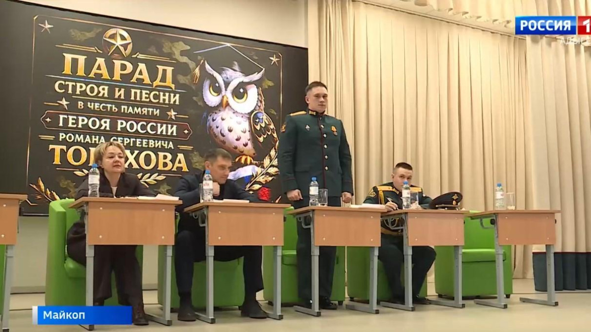 Патриотическое мероприятие, посвященное памяти Героя России Романа Сергеевича Торохова, объединило учеников всех классов майкопской школы, названной в честь Романа. На параде жюри оценивали исполнение строевой песни и элементы строевой подготовки: повороты на месте, исполнение команд и другие.