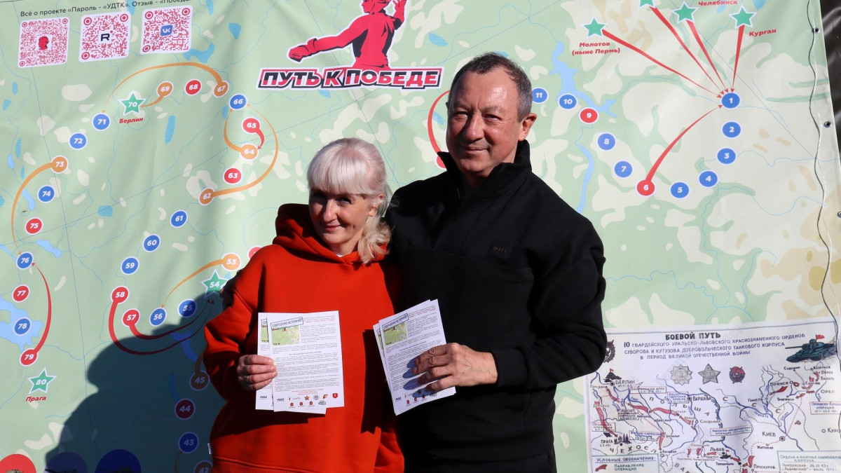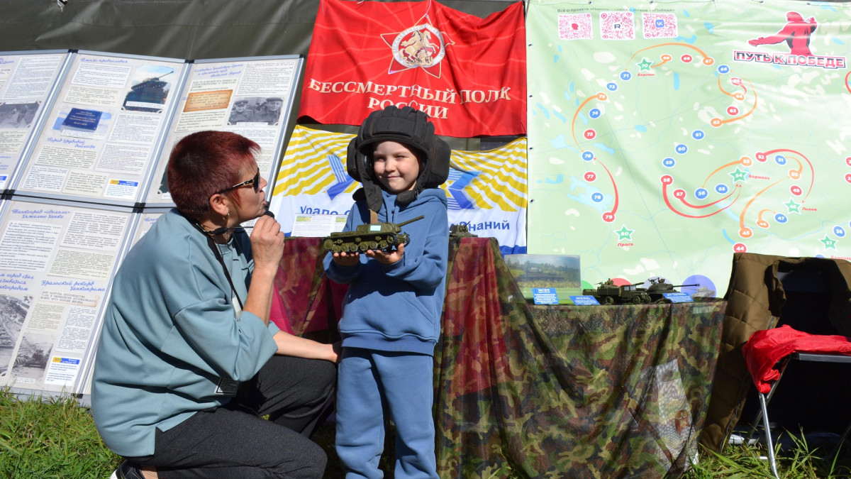 На армейской палатке организаторы просветительской площадки развернули огромный баннер с изображением игрового поля настольной образовательной игры «Путь к Победе» - исторического маршрута доблестного боевого пути Уральского добровольческого танкового корпуса, предоставив всем желающим наглядно ознакомиться с моделями бронетанковой техники времен Великой Отечественной войны.