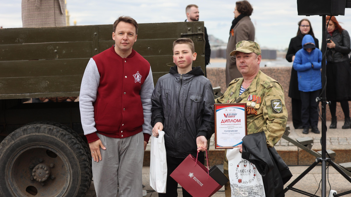 В Санкт-Петербурге победителей всероссийского творческого конкурса «По праву памяти» наградили в рамках автопробега на автомобилях военных лет, который прошел под эгидой «Бессмертного полка России. Автопробег стартовал от Монумента героическим защитникам Ленинграда и завершился на стрелке Васильевского острова. Именно здесь состоялась торжественная церемония награждения, продолжением которой стал импровизированный концерт: артисты исполнили песни и стихи военных лет.
